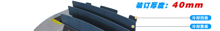 加熱時(shí)間結(jié)束時(shí)五只WORKING燈同時(shí)閃爍,WORKING燈熄滅后將裝訂本取出。插入機(jī)背的冷卻槽中,須使封脊平靠在冷卻槽上約三分后,裝訂完成。