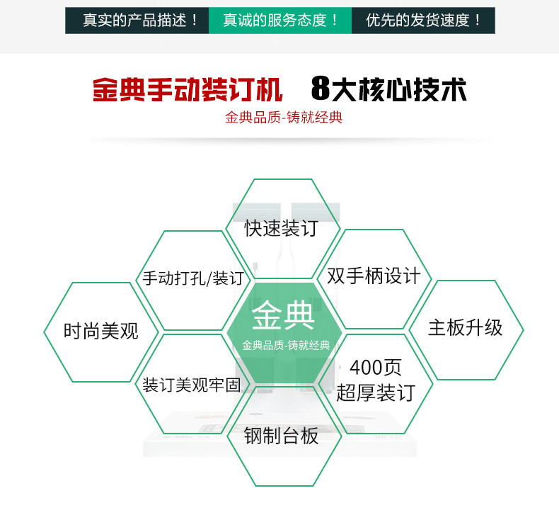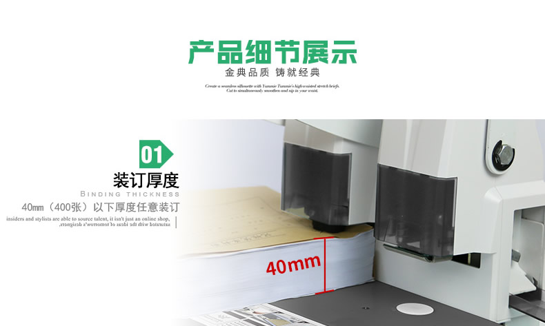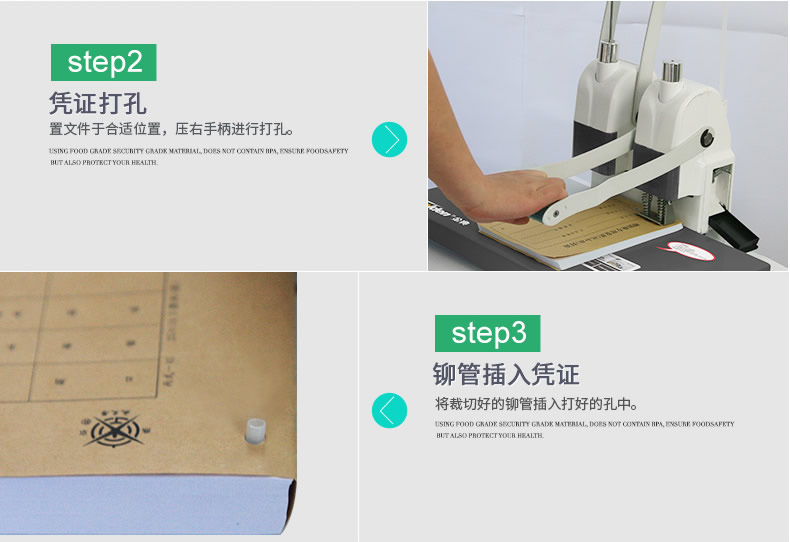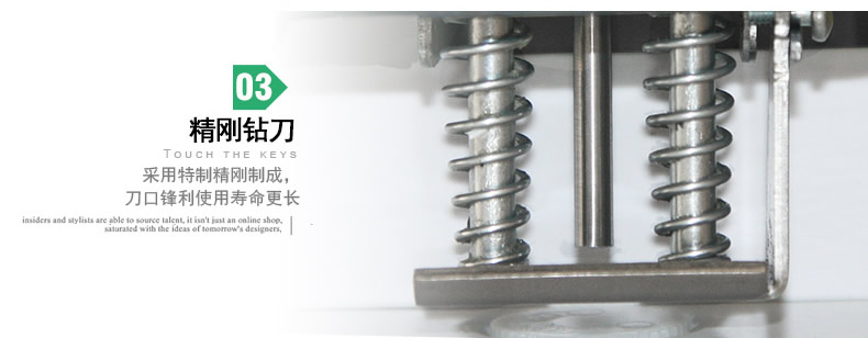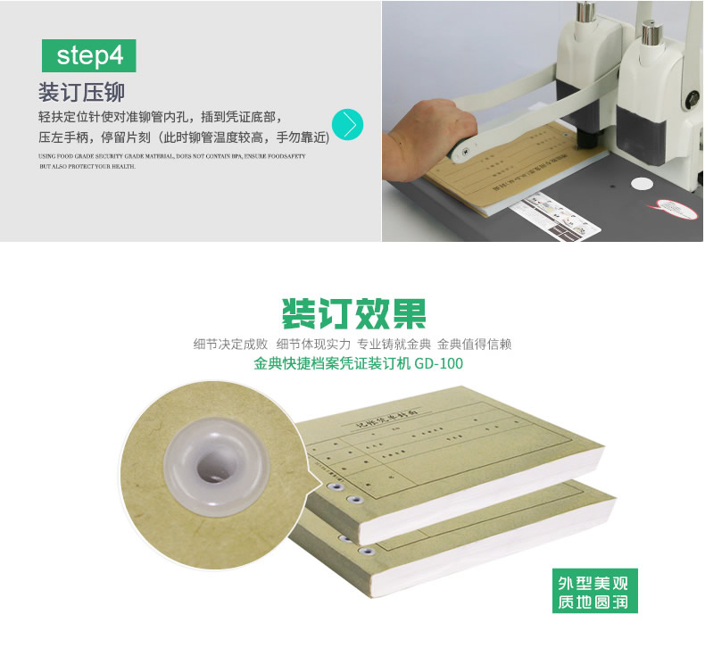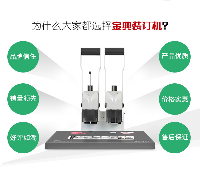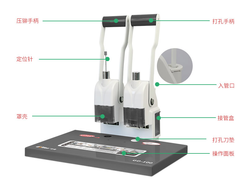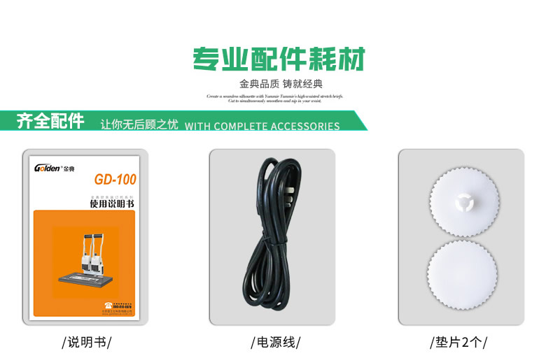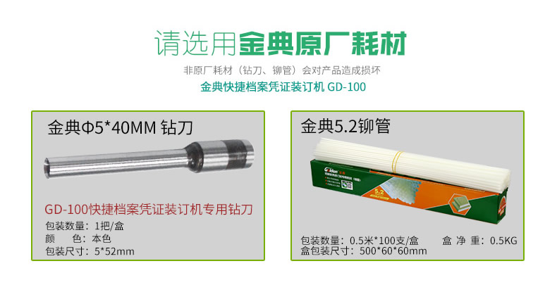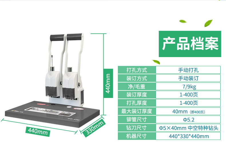 產品類型: 金典 產品特性: GD-100 匹配耗材: 手動 功率: 220v±5% / 50hz 打孔方式: 60W 裝訂方式: Φ5*40 可裝訂材料: Φ5.2 連續(xù)工作時間: 6.0kG/8.4KG 工作溫度(℃): 434mm*320mm*438mm (手柄壓下后高度為272mm) 毛重(kg): 495mm*365mm*395mm 機器凈尺寸(mm): 1-40mm 外包裝尺寸(mm): 手動
