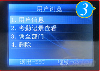 第一步:按"MENU"鍵進(jìn)入操作菜單,選擇"用戶管理"按"OK"鍵。