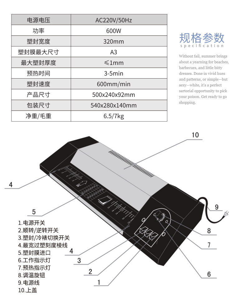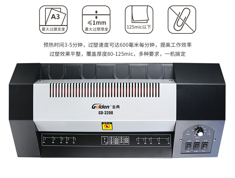 膠裝厚度: 金典 銑刀方式: GD-3208 產(chǎn)地: 320mm 最大裁切尺寸(mm): ≦1mm 裁切厚度(mm): 320mm 前臺面有效深度: 600mm/min 壓紙方式: 3-5min 編程: 6.5/7KG 顯示方式: 500*240*92mm 電源: 540*280*140mm 機(jī)器尺寸(H*D*W)(mm): AC220V /50Hz 包裝尺寸(mm): 600W