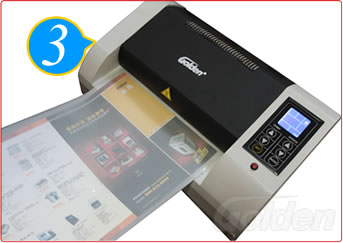 插上電源,根據(jù)膜的厚度調(diào)好溫度,將要塑封的文件放入專業(yè)塑封膜中。
