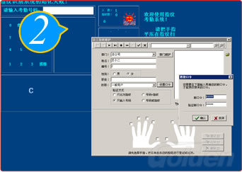 點擊“登記”出現(xiàn)登記窗口,按提示輸入詳細資料,按“設(shè)置口令”進行密碼考勤。點擊“確定”,按窗口上的“√”,填加員工考勤完畢。