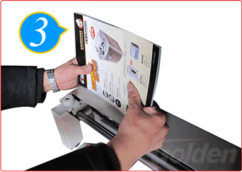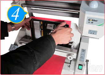 將預(yù)先制作好的封皮(應(yīng)已經(jīng)用壓痕機(jī)或手工制作出折痕)從下放入壓紙夾與翻轉(zhuǎn)臺中間,封面靠向翻轉(zhuǎn)臺及向上,并將封皮緊靠定位柱。為方便放入封皮,可將翻轉(zhuǎn)臺稍為提高。