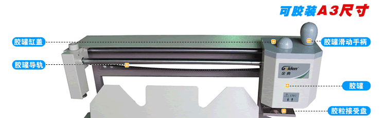 膠裝機(jī)GD-35S的膠罐雙導(dǎo)軌行進(jìn),涂膠均勻,精度高,避免了鈑金結(jié)構(gòu)固有缺陷帶來的誤差。